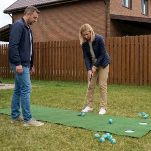 Habe diese Schwamm-Golfbälle mit zum Camping genommen. Leute jeden Alters haben sie benutzt und niemand wurde verletzt. Sie sind sehr leicht, also fliegen sie nicht gefährlich weit.