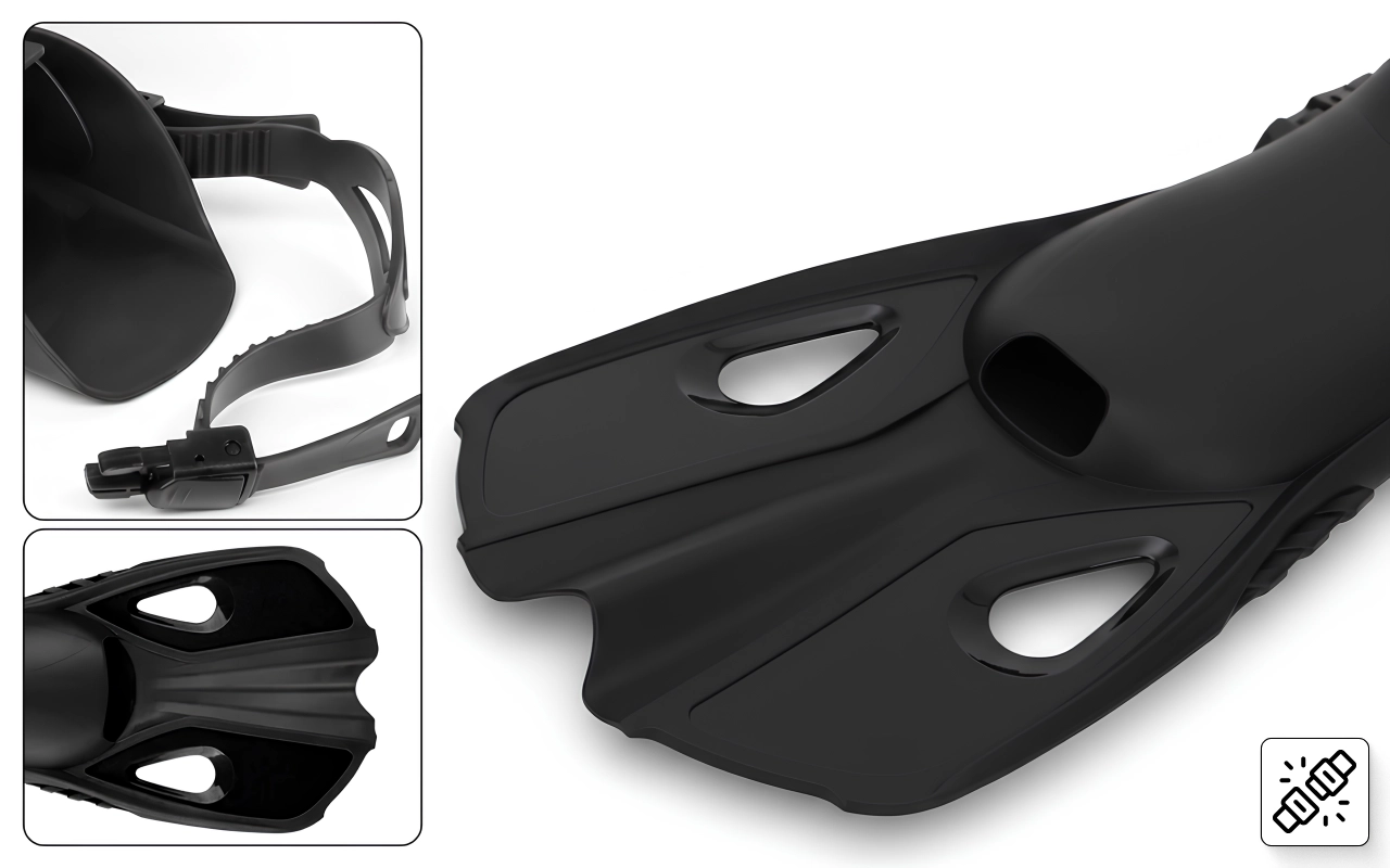 Jeder Schwung bringt mehr Kraft ohne zusätzliche Anstrengung. Die Threo-Flossen bestehen aus weichen Materialien, die den Füßen den ganzen Tag Komfort bieten. Verstellbare Riemen ermöglichen ein schnelles und einfaches Anziehen.