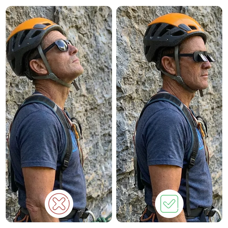 Klettern kann Ihren Nacken belasten und Ihre Konzentration schnell ablenken. Mit Threo-Brillen bleibt Ihre Aufmerksamkeit dort, wo es am wichtigsten ist. Das leichte Design passt problemlos über die meisten Sonnenbrillen oder Korrektionsfassungen. Sehen Sie jeden Schritt klar, ohne etwas zu verpassen. Erleben Sie sicherere Kletterpartien mit weniger Unbehagen.