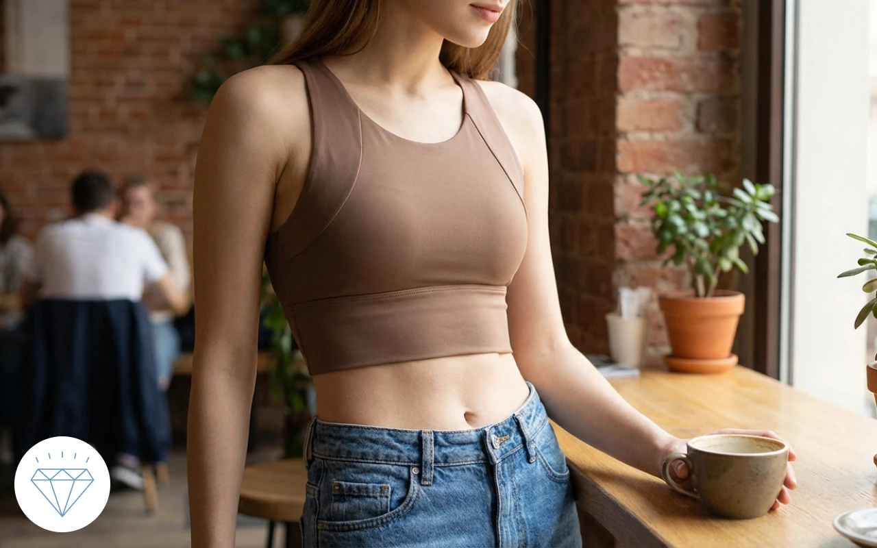 Ich nutze es für Pilates und meine täglichen Erledigungen. Der glatte Stoff kratzt nicht, und ich liebe, wie der Schnitt meine Schultern straff und definiert wirken lässt.