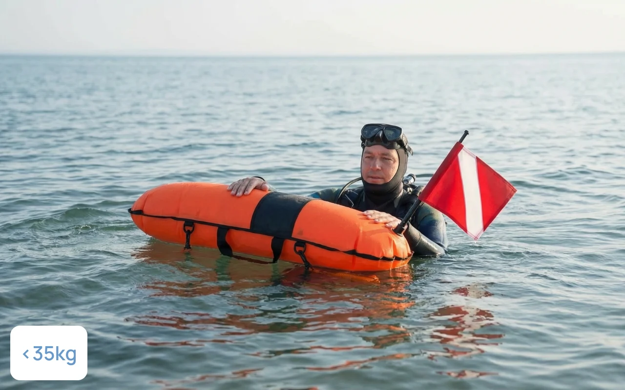 Der Auftrieb hält dich über Wasser, wenn du eine Pause brauchst. Robust genug, um im Notfall bis zu 35 Kilogramm zu tragen.