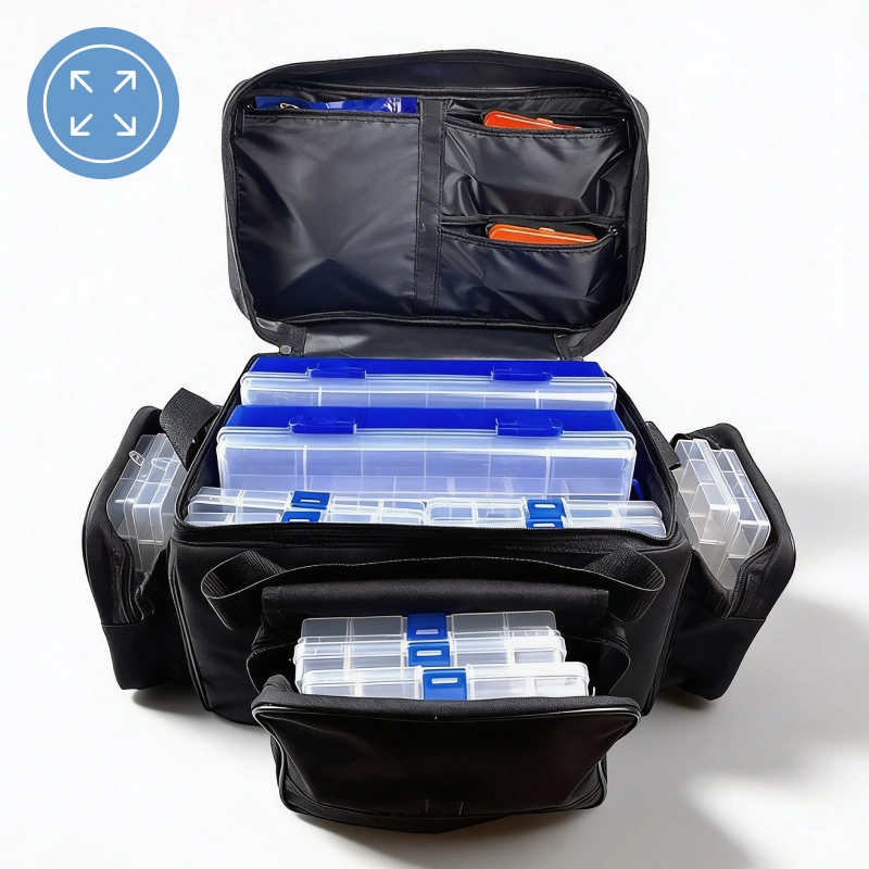 Diese Tasche hilft mir, schnell zu packen. Die Reißverschlüsse laufen reibungslos und meine Schnüre und Haken zu sortieren ist jetzt ein Kinderspiel.