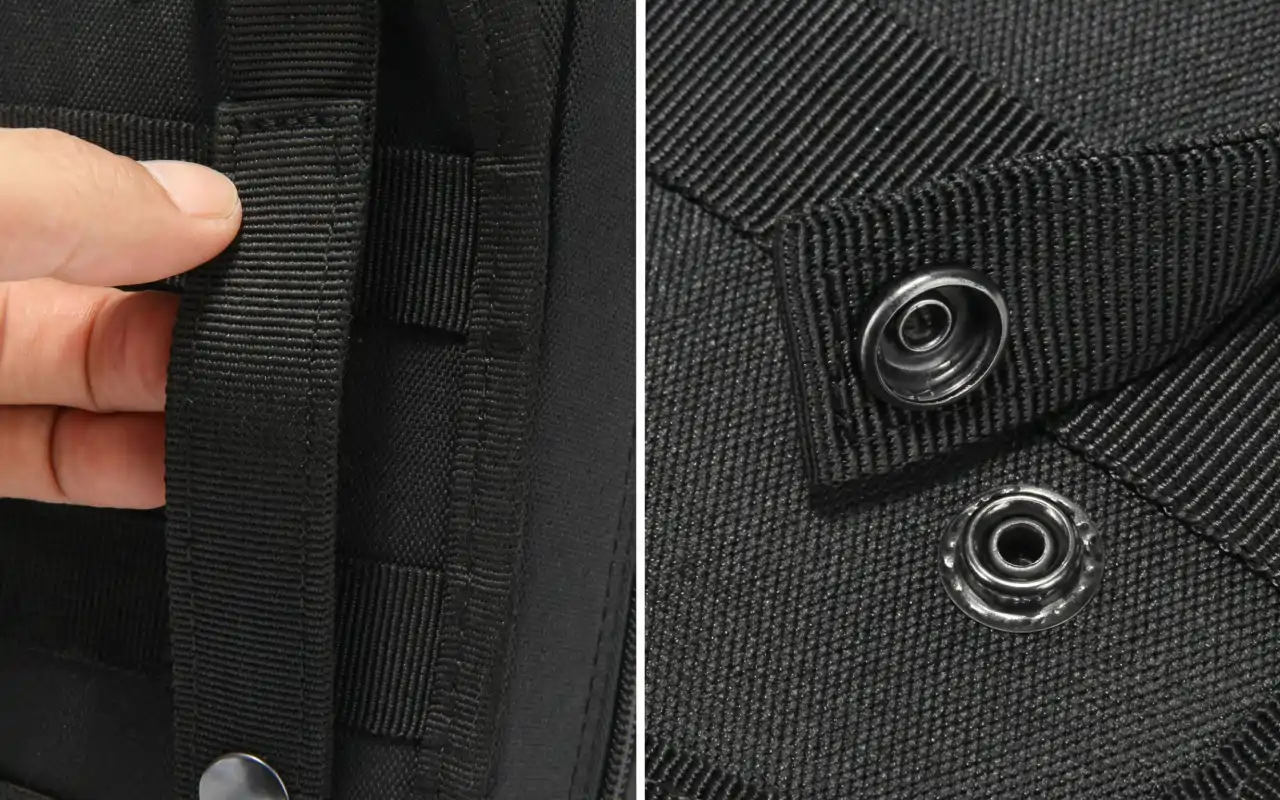 Druckknöpfe aus Kupfer und abreißbare Paneele sichern die Tasche zuverlässig. Befestige oder löse sie schnell von Rucksäcken oder Gürteln für jede Aktivität.