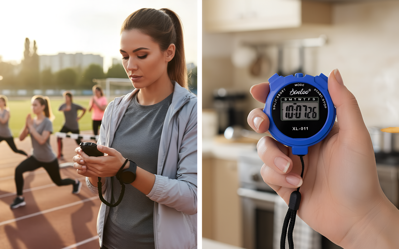 Wechseln Sie schnell zwischen Stoppuhr-, Timer- und Zählmodi. Ein kompaktes Gerät deckt Sport, Hausaufgaben oder Küchenbedarf ab.