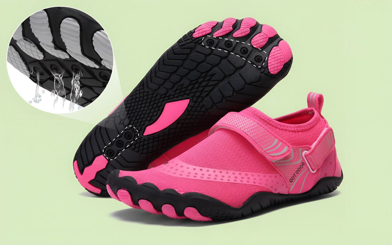 Abflusslöcher leiten überschüssiges Wasser schnell ab und halten die Füße trocken. Kein Unbehagen oder Blasen mehr durch anhaltende Feuchtigkeit.