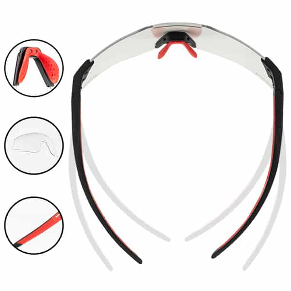 Dank der speziellen Beschichtung ist die Fahrradbrille beschlagfrei, hydrophob, schmutz- und ölabweisend. Die Gläser der Brille sind aus PC (Polycarbonat) gefertigt. Dieses Material blockiert 100% der UVA-, UVB- und UVC-Strahlen sowie schädliches blaues Licht bis zu 400 nm. Die weichen Silikon-Nasenpads passen sich jeder Nase ideal an und sorgen für besten Tragekomfort. Zudem versperrt die rahmenlose Konstruktion nicht die Sicht und sorgt für ein klares peripheres Sehen.