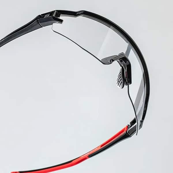 Dank der speziellen Beschichtung ist die Fahrradbrille beschlagfrei, hydrophob, schmutz- und ölabweisend. Die Gläser der Brille sind aus PC (Polycarbonat) gefertigt. Dieses Material blockiert 100% der UVA-, UVB- und UVC-Strahlen sowie schädliches blaues Licht bis zu 400 nm. Die weichen Silikon-Nasenpads passen sich jeder Nase ideal an und sorgen für besten Tragekomfort. Zudem versperrt die rahmenlose Konstruktion nicht die Sicht und sorgt für ein klares peripheres Sehen.