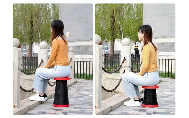 Das Aufstellen unseres Hockers ist dank des leichtgängigen Teleskopmechanismus ein Kinderspiel. Greifen Sie einfach die Knöpfe an beiden Enden, ziehen Sie sie auseinander, drehen Sie sie in die entgegengesetzte Richtung, und stellen Sie den Hocker auf eine geeignete Ebene. In nur vier einfachen Schritten haben Sie Ihren Sitzplatz fertig.