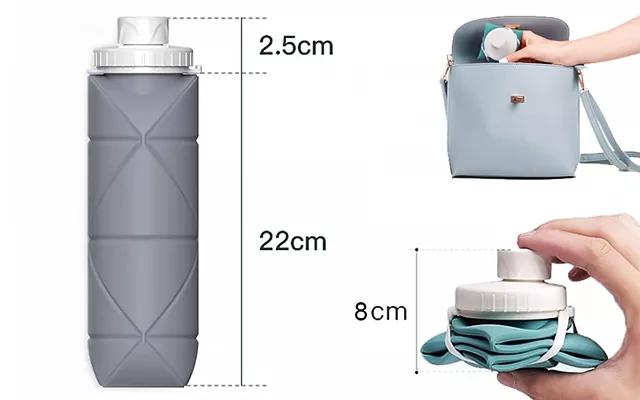 Unsere Silikonflasche lässt sich bequem zusammenfalten, wenn sie nicht gebraucht wird. Sie ist ideal für Reisen, Wanderungen oder andere Outdoor-Aktivitäten.