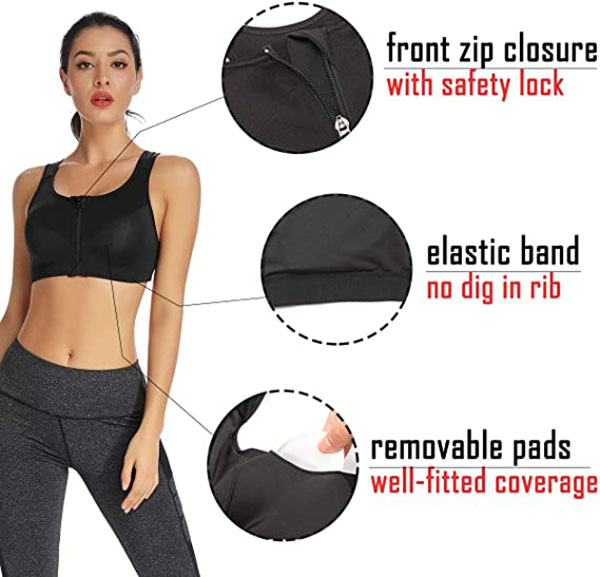 Der I-förmige Träger im Rücken schützt effektiv vor Stößen und verhindert, dass der BH verrutscht. Der BH hat einen Anti-Rutsch-Reißverschluss und Haken, die beim Sport vor dem Herunterrutschen schützen. Ein verstellbares Stützband im Rücken, wie bei einem Alltags-BH mit 3 Verschluss-Sets, ermöglicht die Einstellung der Körbchengröße.