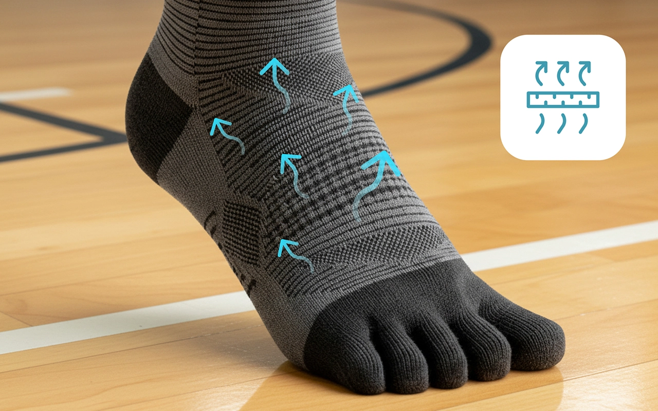 Der Stoff fühlt sich leicht an, hält aber meine Zehen trotzdem getrennt, was hilft, Unannehmlichkeiten zu vermeiden. Schweiß verschwindet schnell, also kein klebriges Gefühl.