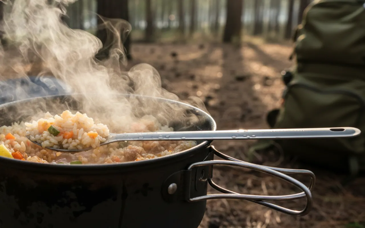 Mit dem langen Griff komme ich jedes Mal sauber an das Essen am Boden von gefriergetrockneten Mahlzeiten, ganz ohne Sauerei!